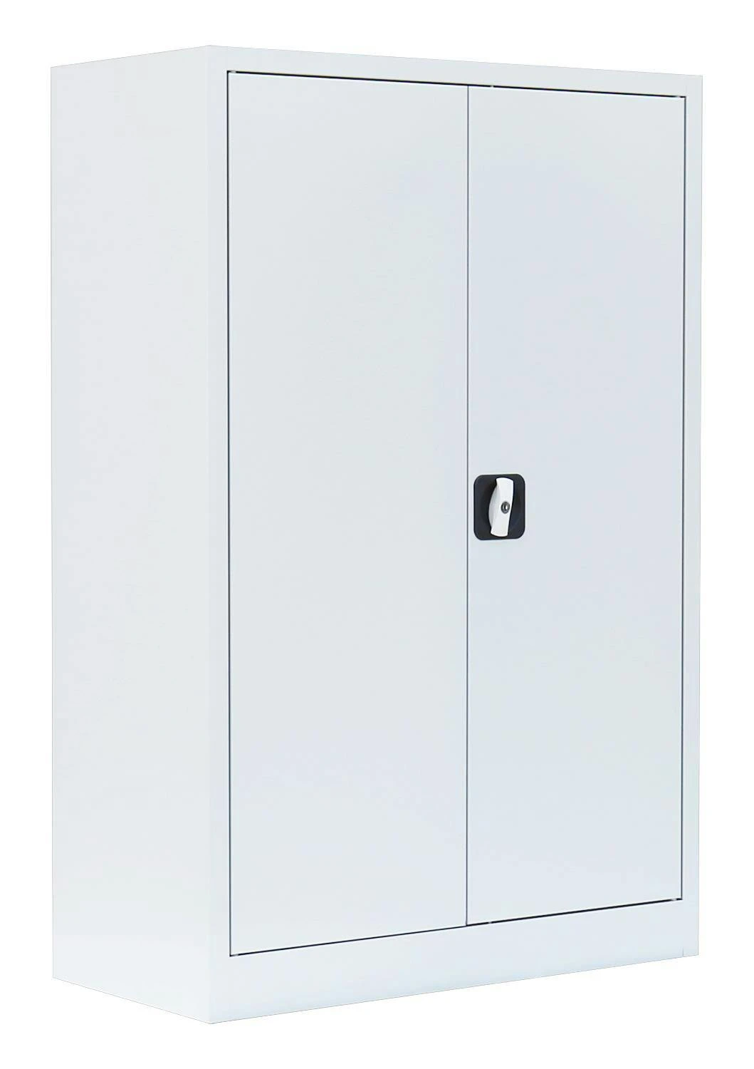 Aktenschrank, Büroschrank, Aktenschrank Metall, Ordnerschrank, Lagerschrank, Werkzeugschrank, mit 2 Einlegeböden (3 Ordnerhöhen). Universell einsetzbar zur Lagerung und Ablage von Aktenordnern und Dokumenten, zum sicheren Aufbewahren (abschließbar durch Schubstangen-Zylinderschloss) und Lagern von Werkzeug, Aufbewahrungsboxen, Verkaufsunterlagen, Katalogen, Papier und Schreibmaterial. Ideal geeignet für Büros, Logistik, Lager, Werkstätten und Containerbüros.Langlebige, pflegeleichte, verschweißte Stahl-Konstruktion 2 Fachböden, 3 Ordnerhöhen Schranktüren jeweils rechts und links angeschlagen, an gefederten Stiftscharnieren befestigt, mittig schließend Kastenverstärkung für eine erhöhte Türstabilität Flexible Nutzung als Aktenschrank oder Regal durch herausnehmbare Flügeltüren Geräuschdämpfende Kunststoff-Türanschlagspuffer serienmäßig Individuelle, flexible Innen-Einteilung durch höhenverstellbare Einlegeböden, im 5 cm-Raster Tragkraft der herausnehmbaren Einlegeböden bis zu 65 kg Einlegeböden serienmäßig in Korpusfarbe ausgeführt 2-Wege-Schubstangenzylinderschloss mit Drehgriff, inkl. 2 Schlüssel Korpus und Türen elektrostatisch, glatt pulverbeschichtet Qualität und Sicherheit Komplett verschweißt, keine Montage erforderlich, nur Fachböden müssen eingelegt werden