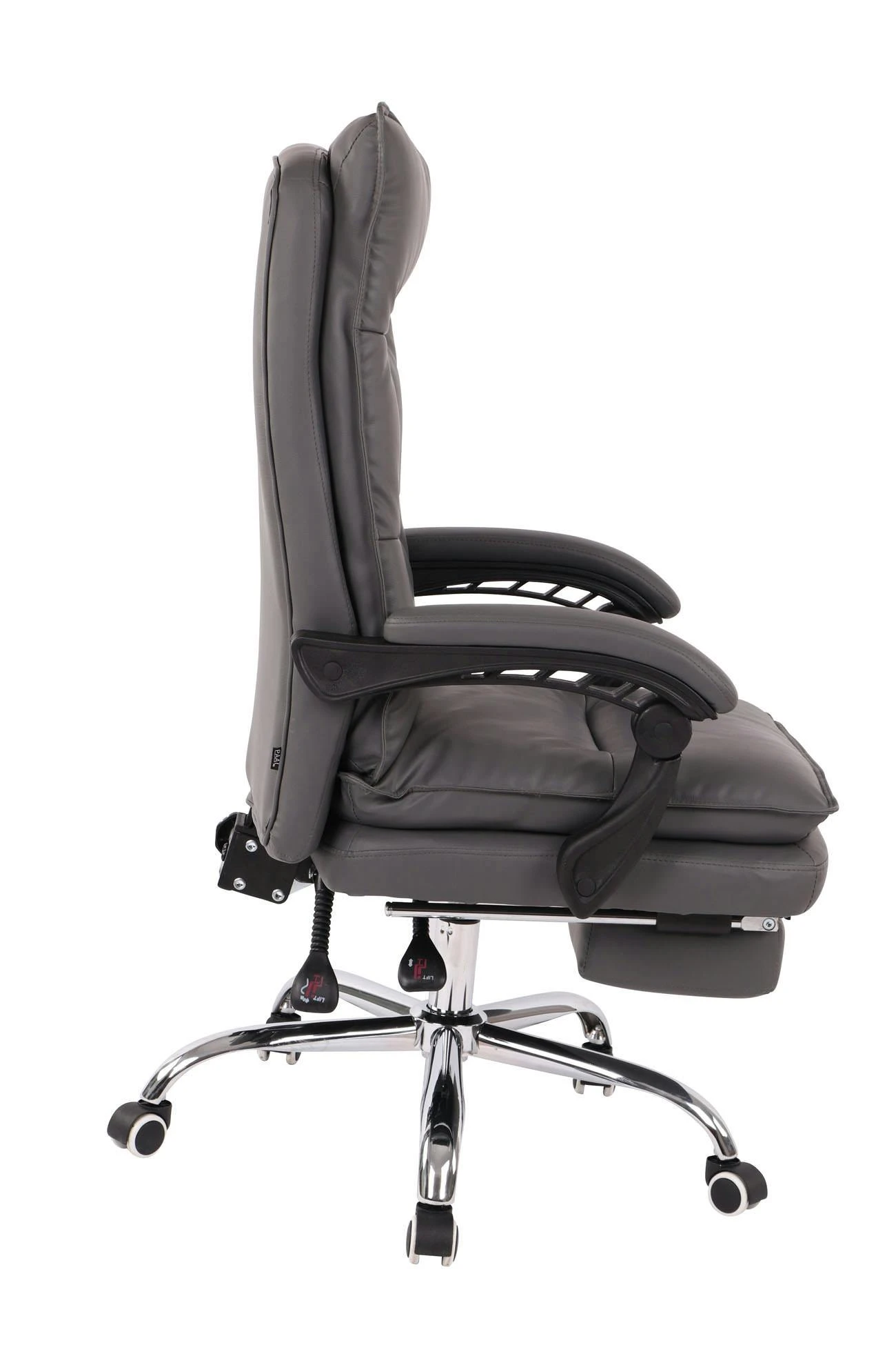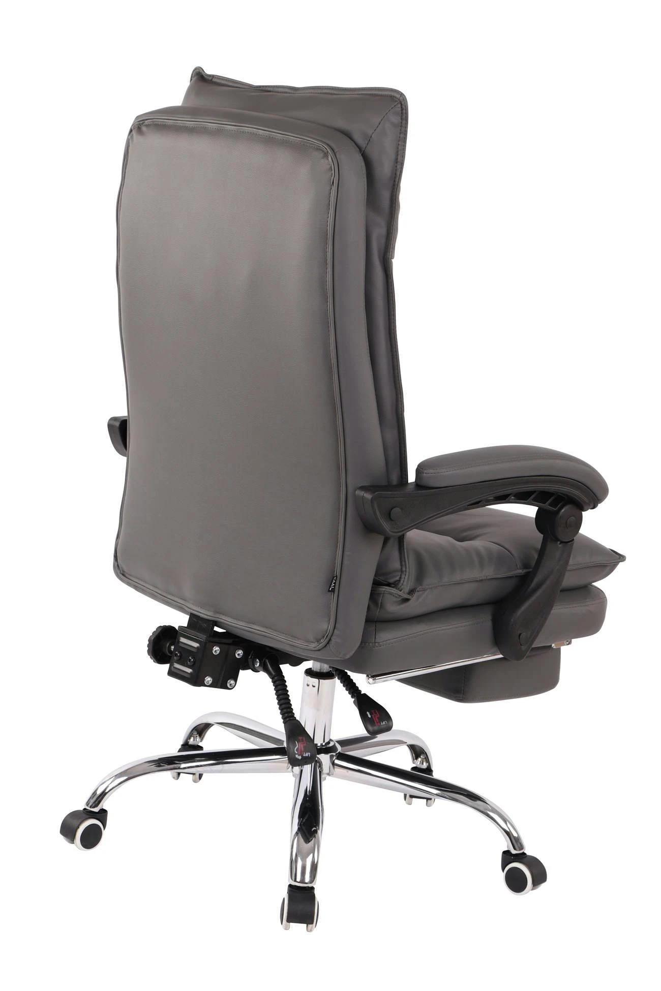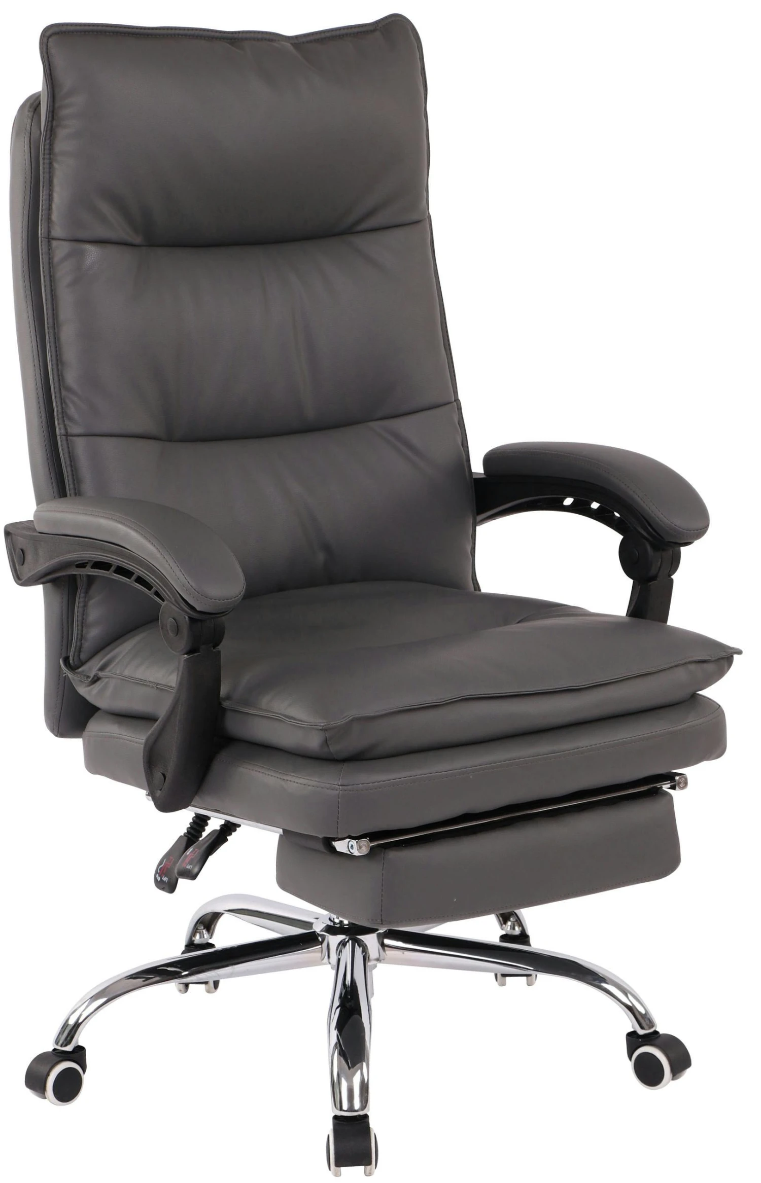 Komfort ist mit dem Bürostuhl Power im klassischen Look angesagt. Eine hochwertige Polsterung und ein pflegeleichter Kunstlederbezug sorgen für ein komfortables Sitzgefühl, welches auch bei längerem Verweilen bestehen bleibt. Die leicht verstellbare Fußstütze und Rückenlehne sorgen zusätzlich für eine angenehme Pause zwischendurch, bei der sich entspannt zurückgelehnt werden darf und die Beine hochgelegt werden können. Dank der stufenlos verstellbaren Sitzhöhe garantiert der Chefsessel zudem jederzeit ein ergonomisches Sitzen. Dabei steht er standsicher auf fünf Leichtlaufrollen und einem Gestell aus Metall in Chromoptik. Egal ob Hart- oder Teppichböden – man kann immer leicht und locker über den Boden rollen.