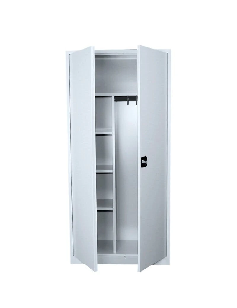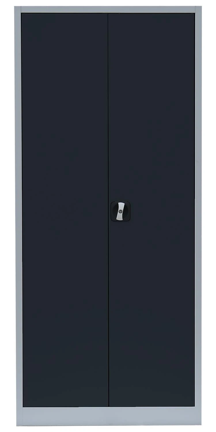 Universalschrank mit Flügeltüren, Fachböden und KleiderstangeLanglebige, pflegeleichte, verschweißte Stahl-Konstruktion Schranktüren jeweils rechts und links angeschlagen, an gefederten Stiftscharnieren befestigt, mittig schließend Kastenverstärkung für eine erhöhte Türstabilität Flexible Nutzung durch herausnehmbare Flügeltüren Geräuschdämpfende Kunststoff-Türanschlagspuffer serienmäßig Inneneinteilung: Durchgehender Hutboden, rechte Seite mit schwarzer Ovalprofil-Kleiderstange und drei verschiebbaren Kleiderhaken, linke Seite mit 3 Einlegeböden Individuelle, flexible Innen-Einteilung durch höhenverstellbare Einlegeböden, im 5 cm-Raster Tragkraft der herausnehmbaren Einlegeböden bis zu 65 kg Einlegeböden serienmäßig in Korpusfarbe ausgeführt 2-Wege-Schubstangenzylinderschloss mit Drehgriff, inkl. 2 Schlüssel Korpus und Türen elektrostatisch, glatt pulverbeschichtet Qualität und Sicherheit Komplett verschweißt, keine Montage erforderlich, nur Fachböden müssen eingelegt werdenMaße: 1800 x 800 x 383 mm (HxBxT)