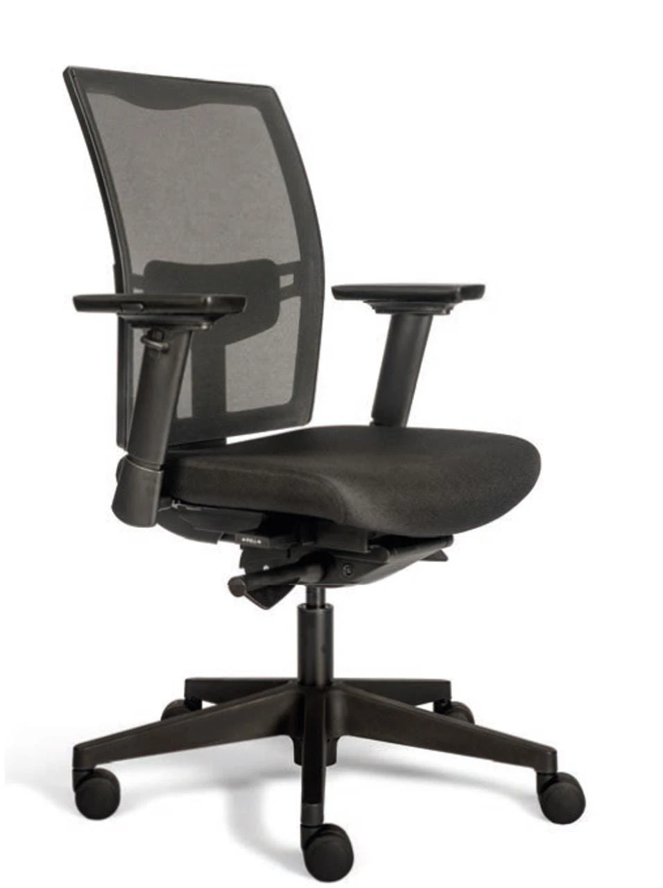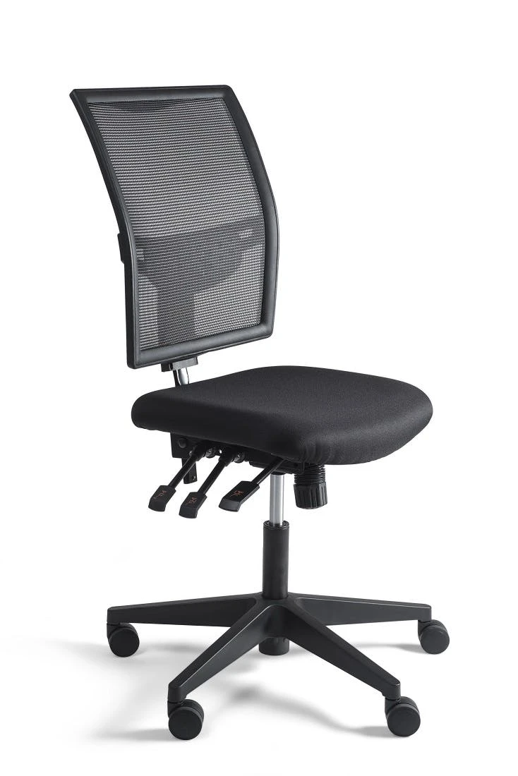 Kassenstuhl, Maße: H 910-1190 mm, mit gepolsterter höhenverstellbarer Rückenlehne, gepolsterter Sitz mit Stoffbezug, Sitzhöhenverstellung 480-630 mm, Rücken- und Sitzwinkelverstellung, 160 mm Gasfeder, schwarzes Kunststofffußkreuz mit multifunktionellen 60 mm Doppelrollen.