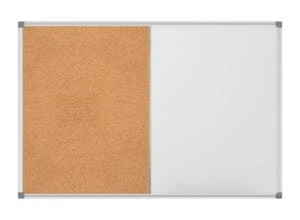 Kombi-Tafel, Höhe x Breite 600 x 900 mm, Tafeloberfläche Korkseite pinnbar, Whiteboardseite magnethaftend, beschriftbar und trocken abwischbar, Tafel aus Kork/Stahl in braun/weiß, Rahmen aus Aluminium mit Kunststoff-Ecken eloxiert in silber, Lieferumfang inklusive Montagematerial.