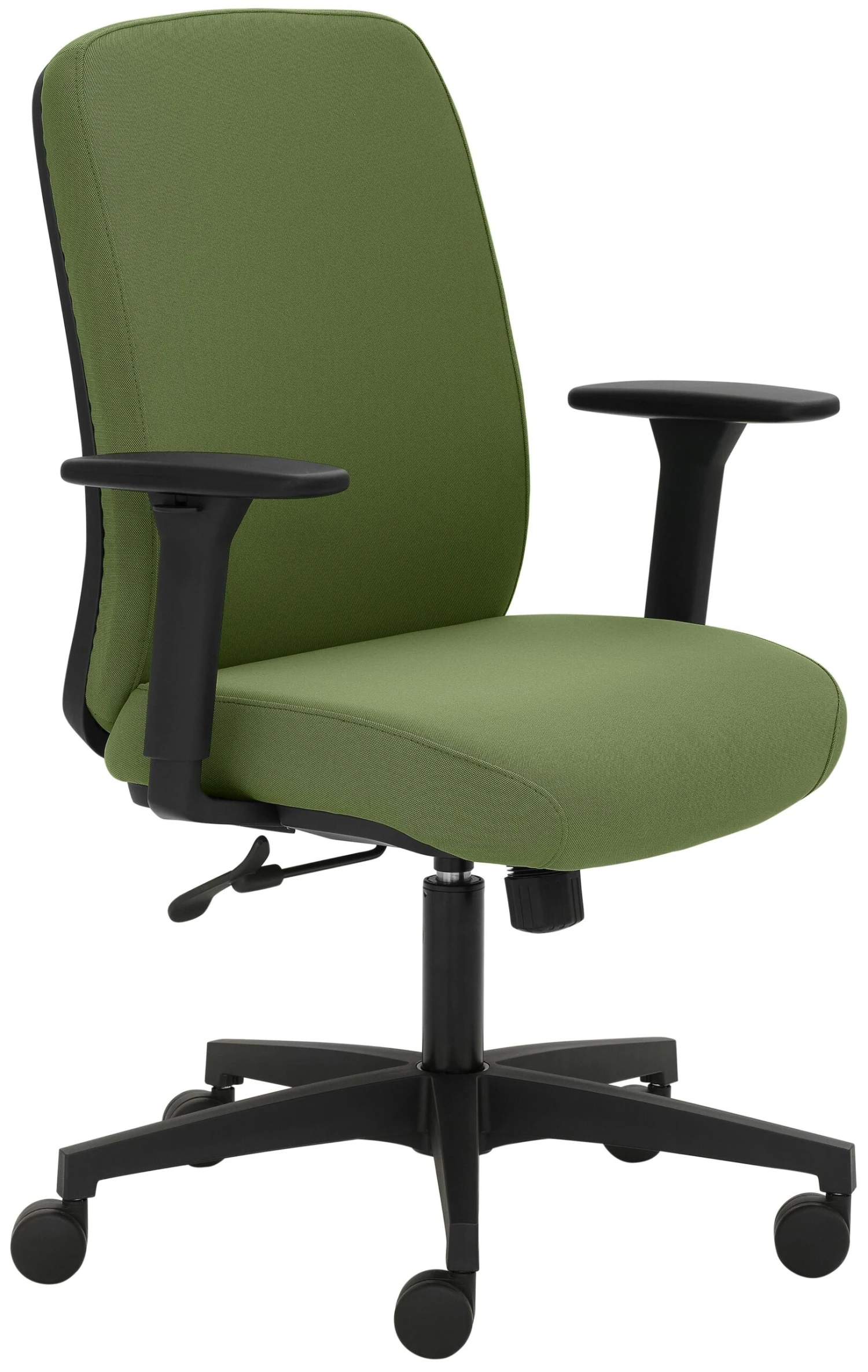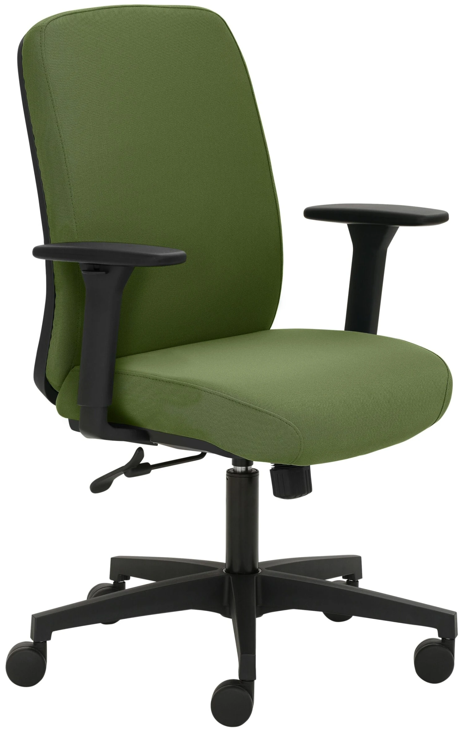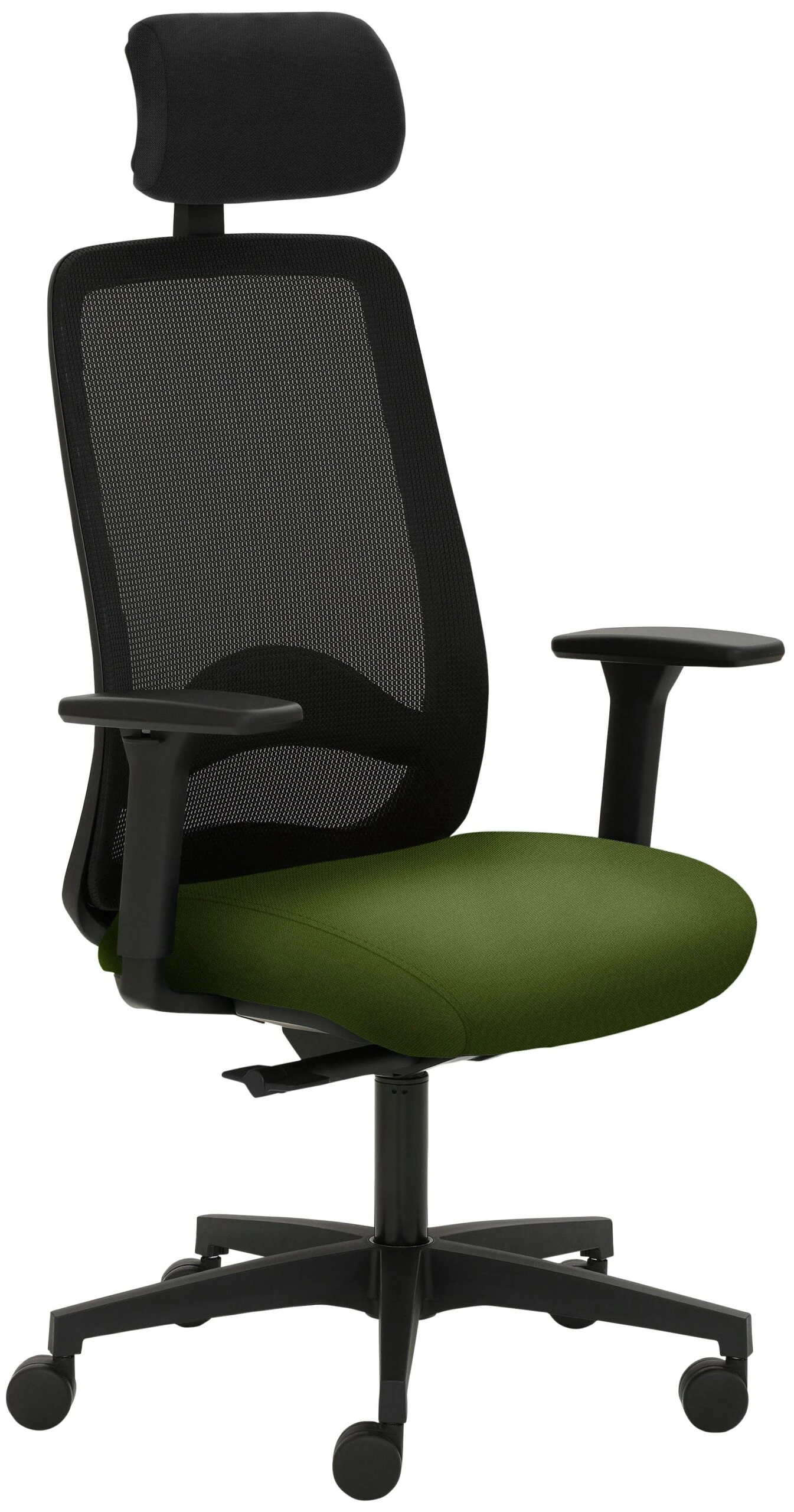 Niedriger Rücken, Sitz und Rücken gepolstert, extra stark gepolsterte Sitzfläche für ein Maximum an Komfort, Synchronmechanik mit individueller Gewichtseinstellung, höhenverstellbare Lordosenstütze, Kunststoff-Fußkreuz schwarz, stufenlose Höhenverstellung, Gasfeder schwarz, inkl. Rollen für Teppichböden, Stuhl GS-zertifiziert, Typ C nach DIN EN 1335 – 1 (belastbar bis max. 110 kg). Sitzhöhe 47 – 58 cm. 3D-Armlehnen schwarz.