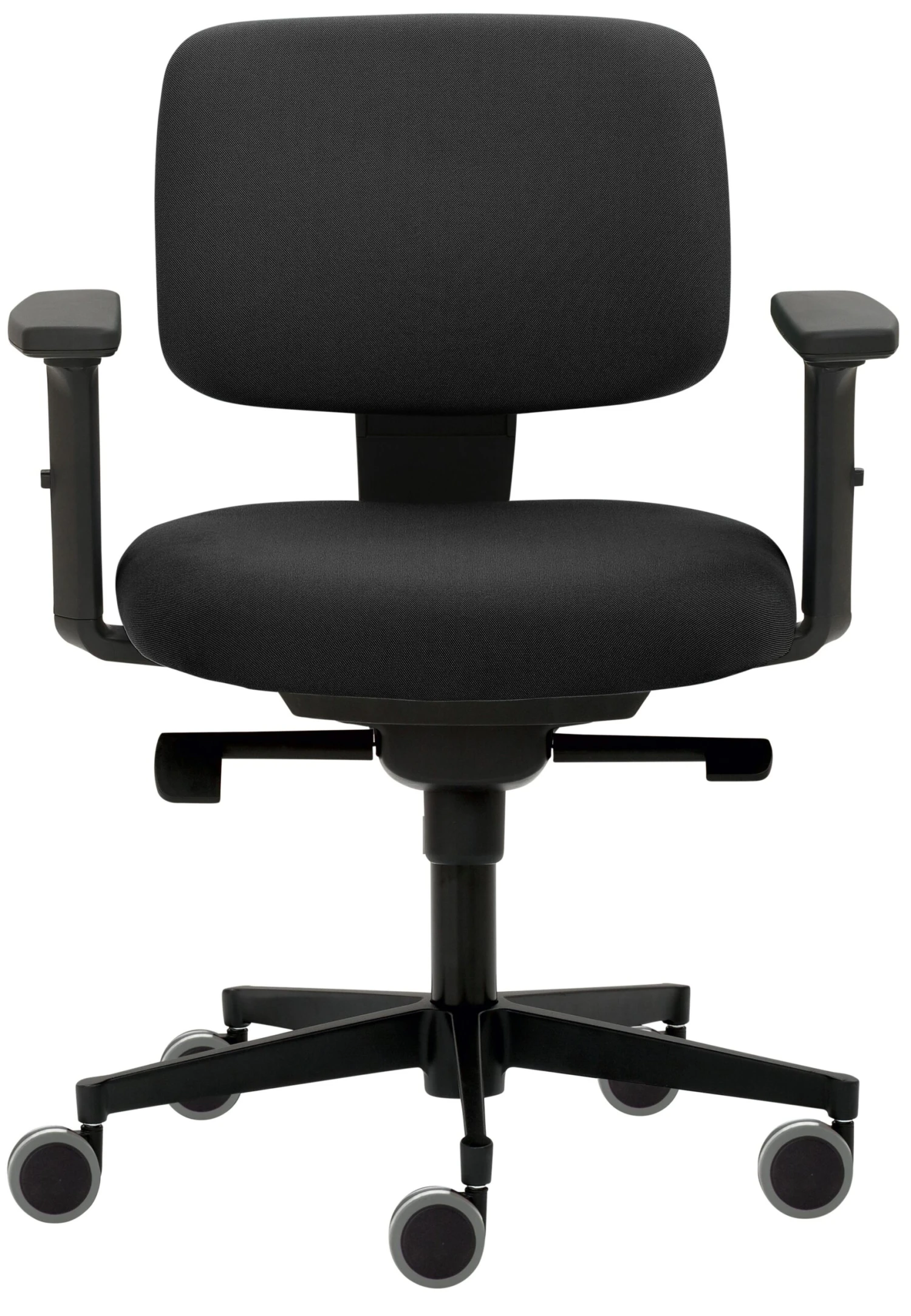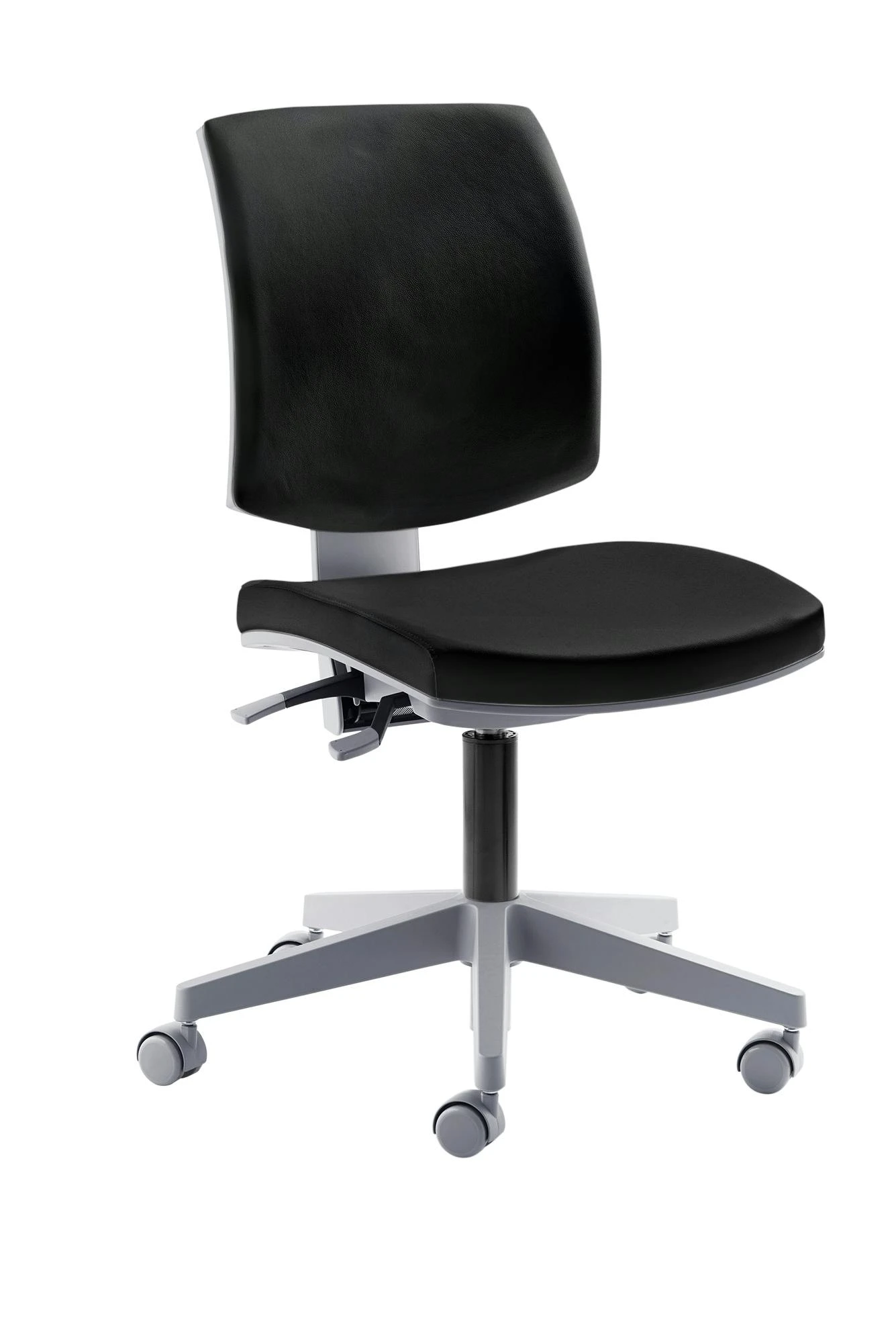 Gestell grau, Sitz und Rücken gepolstert, Sitztiefe durch Rückenverstellung sehr leicht und stufenlos verstellbar, stufenlose Höhenverstellung durch Gasfeder, Fußkreuz Kunststoff grau, inkl. Universalrollen, Sitzhöhe 44 – 54 cm. Belastbar bis 150 kg. Besonders für Frauen geeignet.