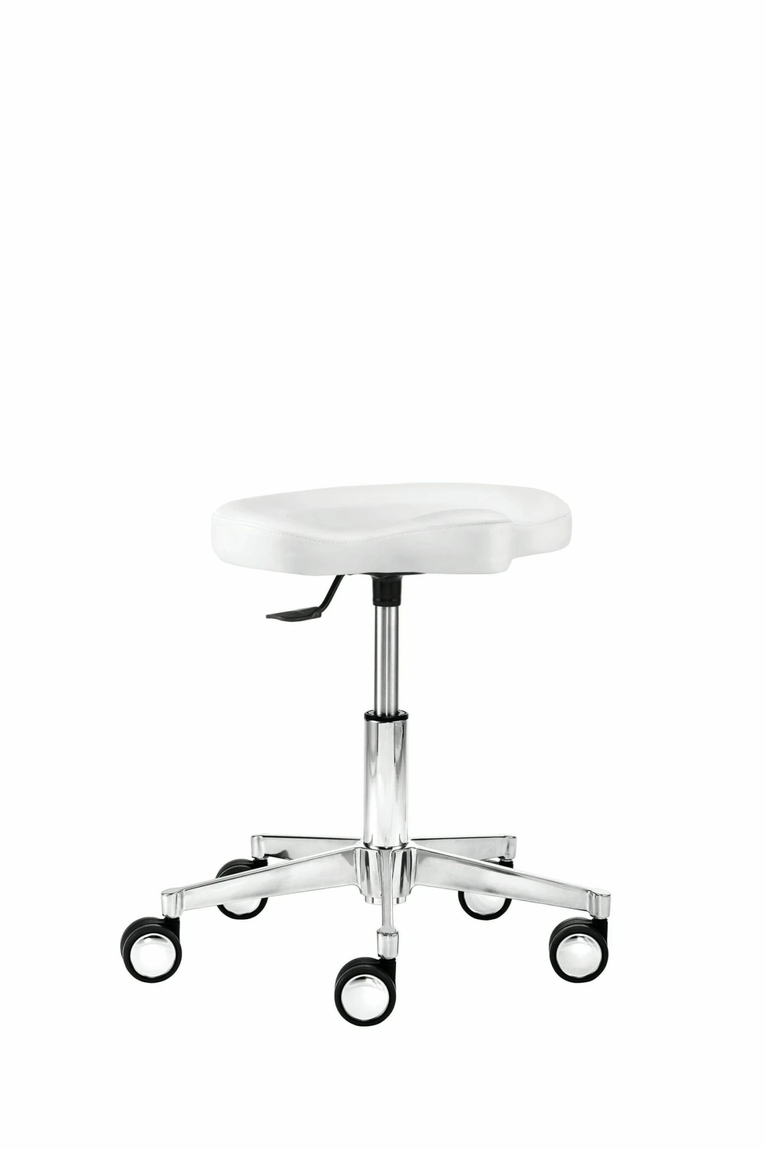 Tellersitz und Rücken gepolstert, Rückenlehne/Armauflage 360° drehbar und höhenverstellbar, Rücken-Raster-Höhenverstellung, Höhenverstellung in Rastertechnik, Rückenhalterung und Ringauslöser pulverbeschichtet schwarz, Polyamid-Fußkreuz schwarz (ø 61 cm), stufenlose Höhenverstellung durch Gasfeder, inkl. Rollen für Teppichböden, Sitzhöhe 40 – 48 cm.