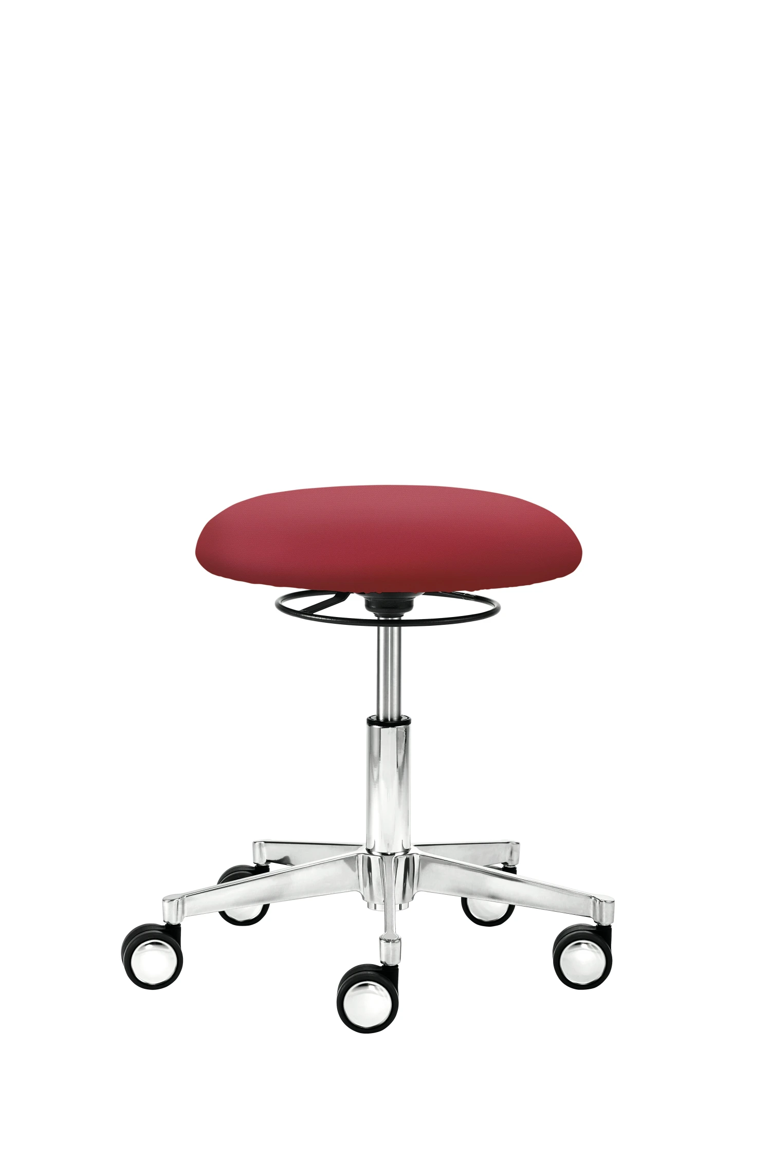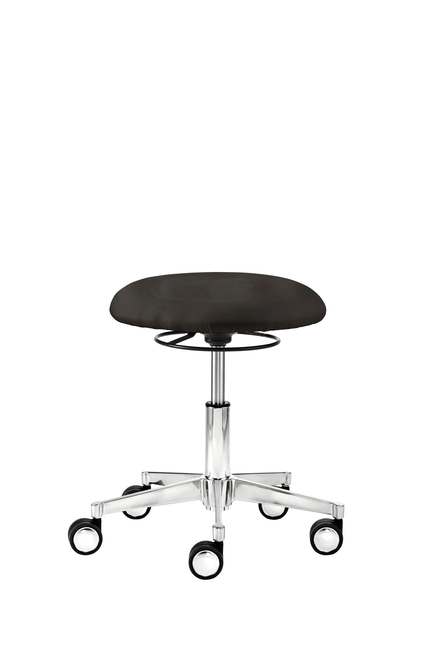 Mit Tellersitz, stufenlose Höhenverstellung durch Gasfeder, Bewegungsfreiheit 360°, Ringauslöser, Alu-Fußkreuz (ø 52 cm), inkl. Hartbodenrollen mit Chromblende, Sitzhöhe 41,5 – 52,5 cm.
