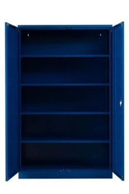 Der Stahlschrank ist komplett aus Metall gefertigt. Die Oberflächen sind aus elektrostatisch pulverbeschichtetem Metall hergestellt und dadurch besonders robust. Die vier Fachböden sind in 5 cm Abständen in der Höhe verstellbar. So bietet der Metallschrank auf insgesamt fünf Ordnerhöhen reichlich Stauraum. Der Schrank ist zusätzlich abschließbar und es werden zwei Schlüssel mitgeliefert.