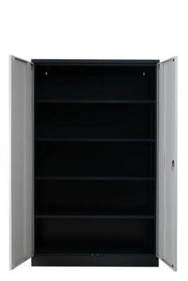 Der Stahlschrank ist komplett aus Metall gefertigt. Die Oberflächen sind aus elektrostatisch pulverbeschichtetem Metall hergestellt und dadurch besonders robust. Die vier Fachböden sind in 5 cm Abständen in der Höhe verstellbar. Bei gleichmäßig verteilter Last, beträgt die Traglast pro Ebene 85 kg. So bietet der Metallschrank auf insgesamt fünf Ordnerhöhen reichlich Stauraum. Der Schrank ist zusätzlich abschließbar und es werden zwei Schlüssel mitgeliefert.