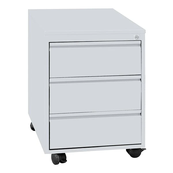 Stahl-Rollcontainer mit 3 Schubladen mit 3 Schublade und durchgehender Frontleisteseparater Stifteeinsatzverschließbar durch Zylinderschloss, inkl. 2 Schlüssel.Führung der Schubladen in Teleskop-SchienenSchubladentiefe 530 mmGehäuse, Schubladen und Stahl-Abdeckplatte pulverbeschichtet in RAL 7035 Lichtgrau4 Doppelrollen Maße: 550 x 400 x 590 mm (H x B x T)