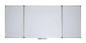 Whiteboard, Höhe x Breite 1000 x 1500 mm, Breite ausgeklappt 3000 mm, Tafeloberfläche mit Emaillebeschichtung, magnethaftend, beschriftbar und trocken abwischbar, 2 ausklappbare Flügel und insgesamt 5 Schreibflächen und Ablageschale, Rahmen aus Aluminium mit Kunststoff-Ecken in silber, Lieferumfang inklusive Montagematerial.